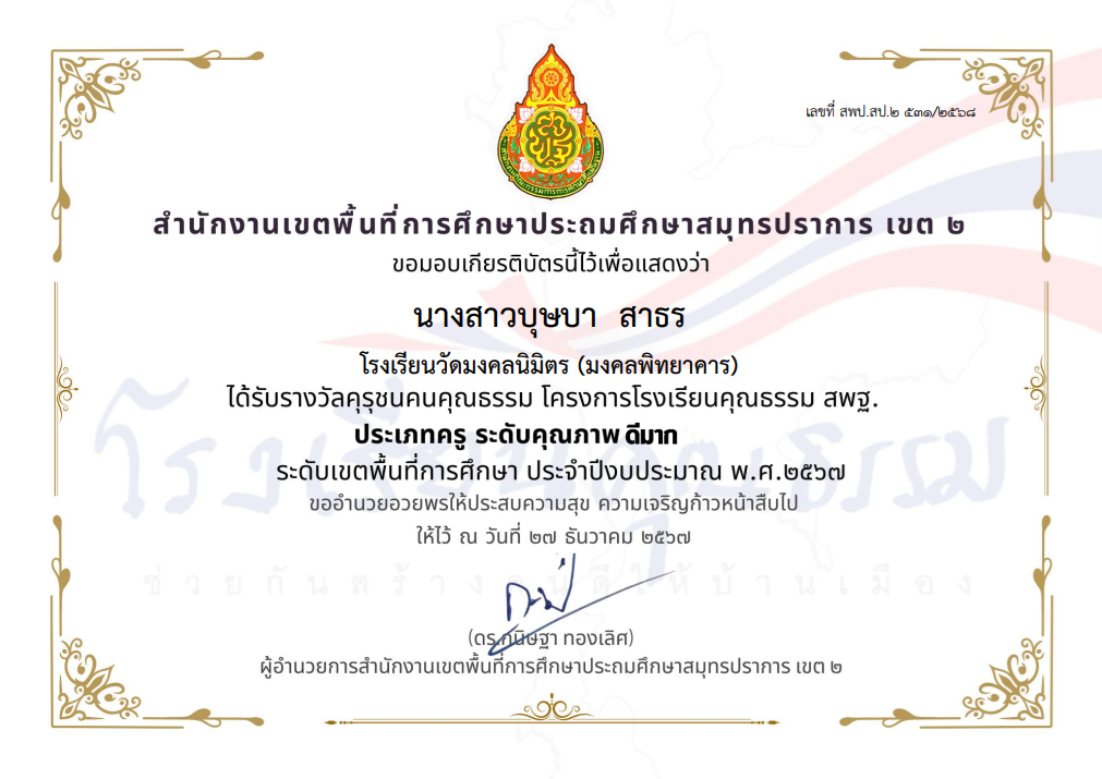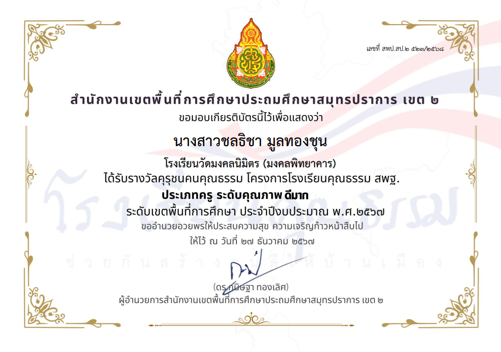 นางสาวชลธิชา มูลทองชุน ได้รับรางวัลคุรุชนคุณธรรม โครงการโรงเรียนคุณธรรม สพฐ. ประเภทครู ระดับคุณภาพ ดีมาก ระดับเขตพื้นที่การศึกษา ประจำปีงบประมาณ พ.ศ.2567 |