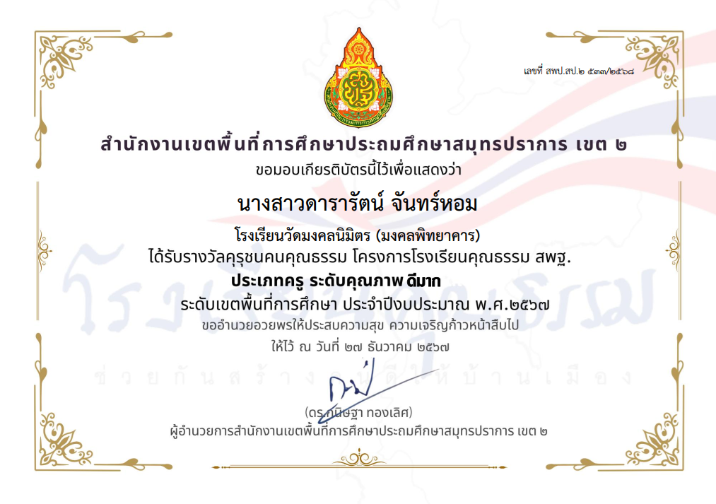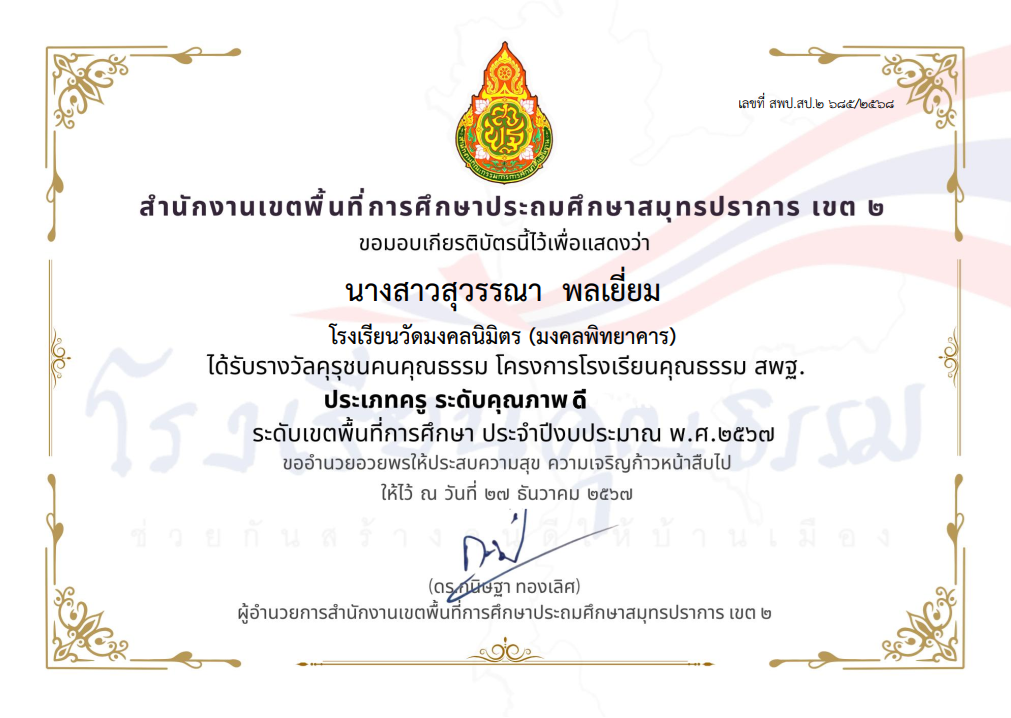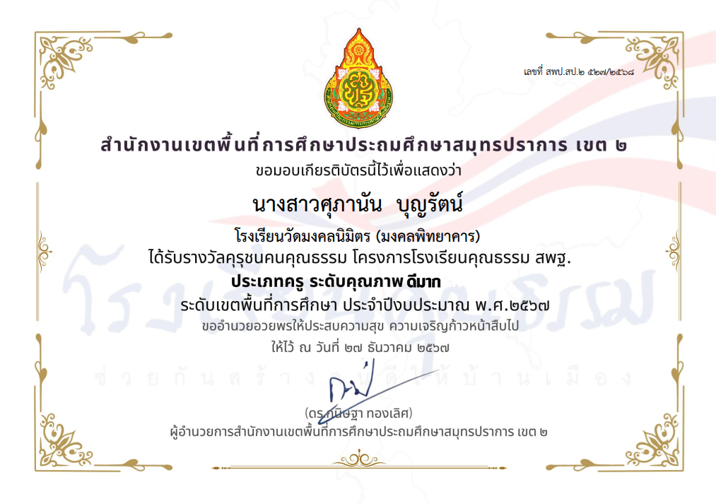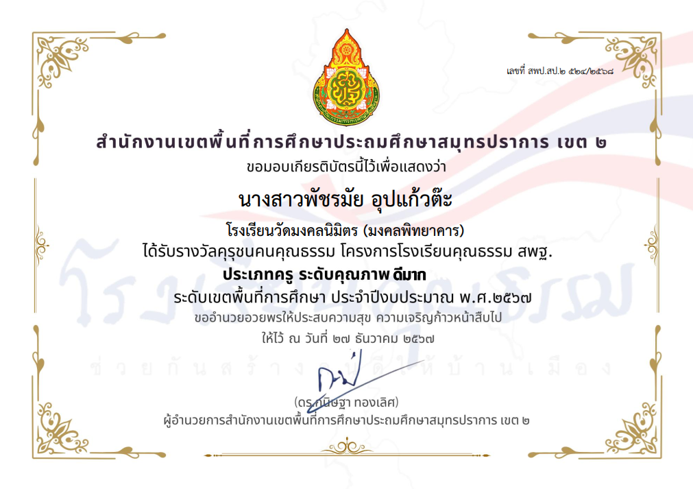 นางสาวพัชรมัย อุปแก้วต๊ะ ได้รับรางวัลคุรุชนคุณธรรม โครงการโรงเรียนคุณธรรม สพฐ. ประเภทครู ระดับคุณภาพ ดีมาก ระดับเขตพื้นที่การศึกษา ประจำปีงบประมาณ พ.ศ.2567 |