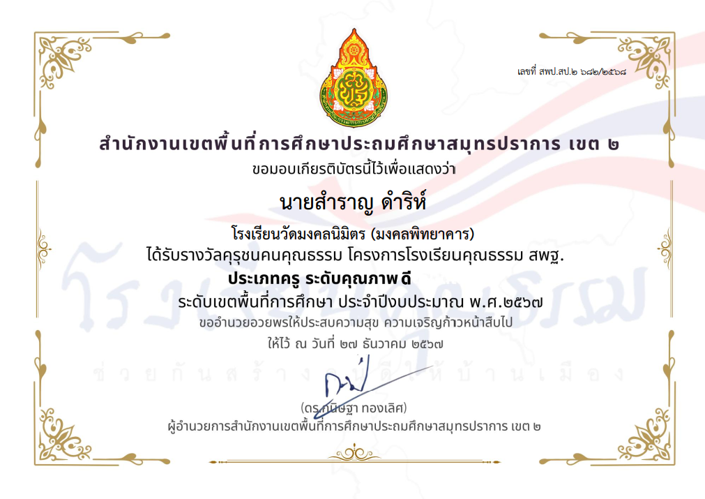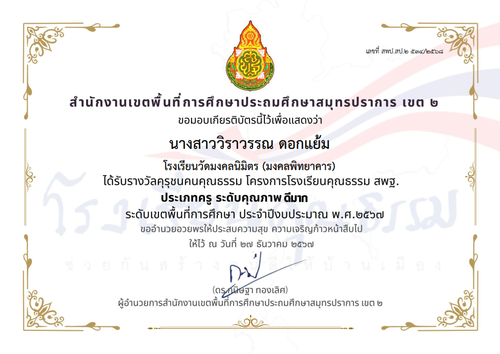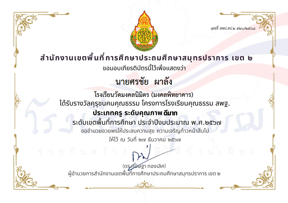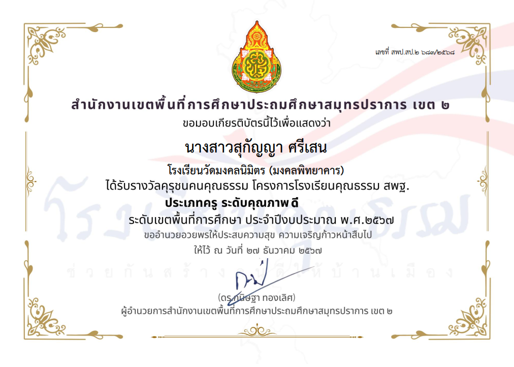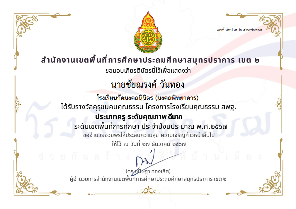 นางสาวพัชรมัย อุปแก้วต๊ะ ได้รับรางวัลคุรุชนคุณธรรม โครงการโรงเรียนคุณธรรม สพฐ. ประเภทครู ระดับคุณภาพ ดีมาก ระดับเขตพื้นที่การศึกษา ประจำปีงบประมาณ พ.ศ.2567 |