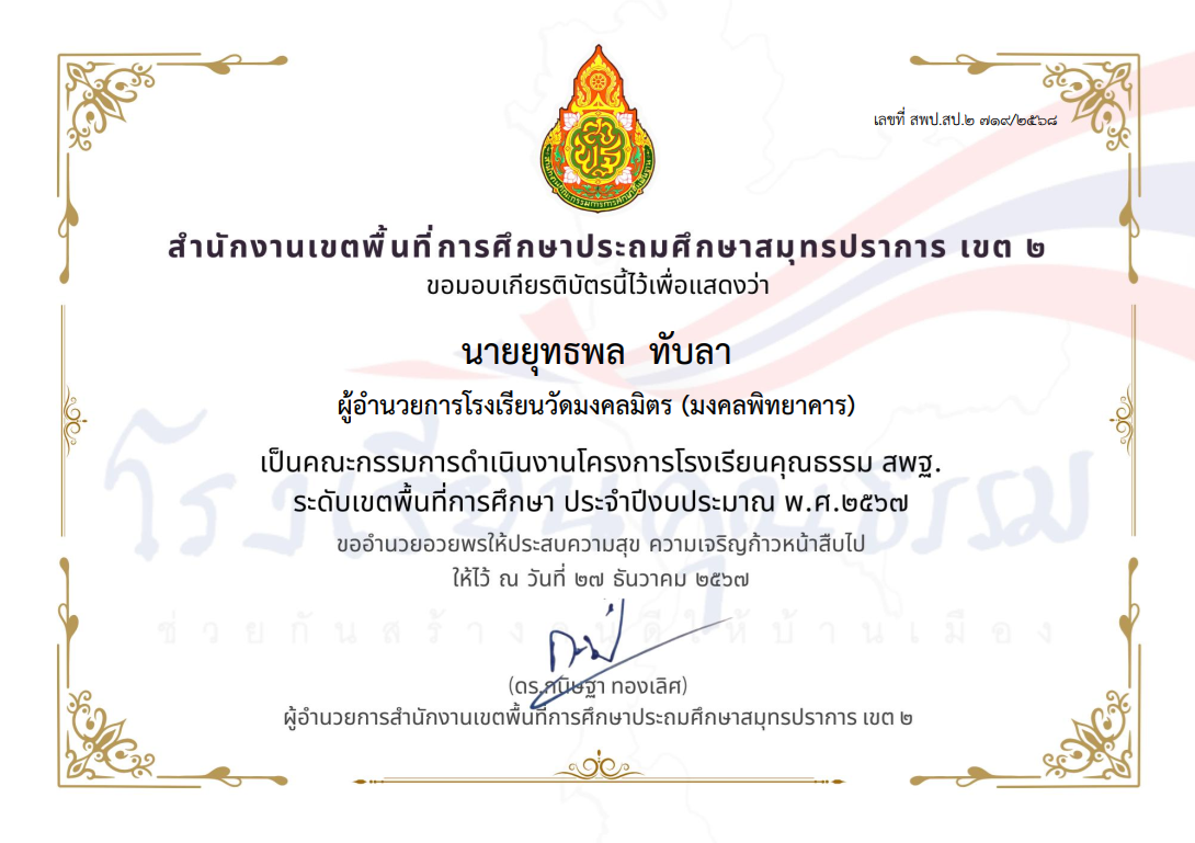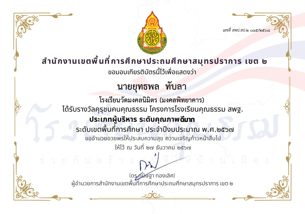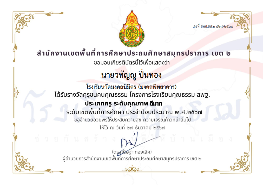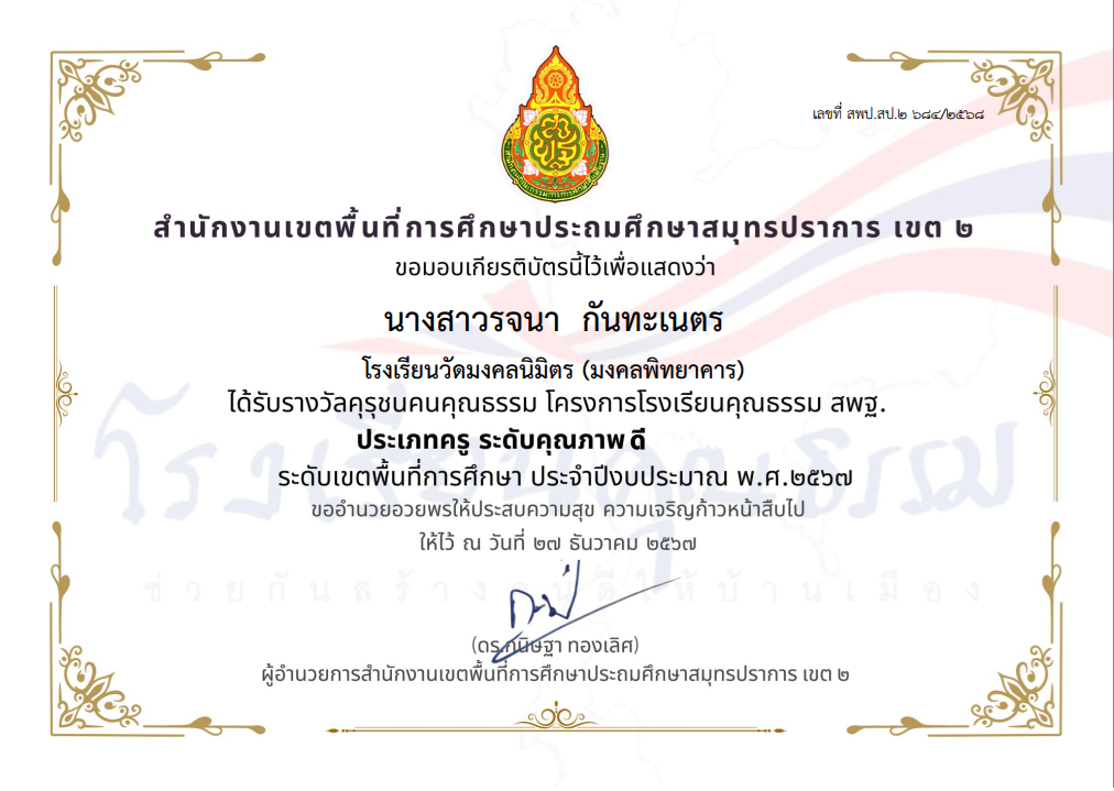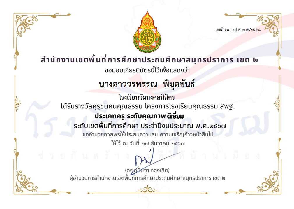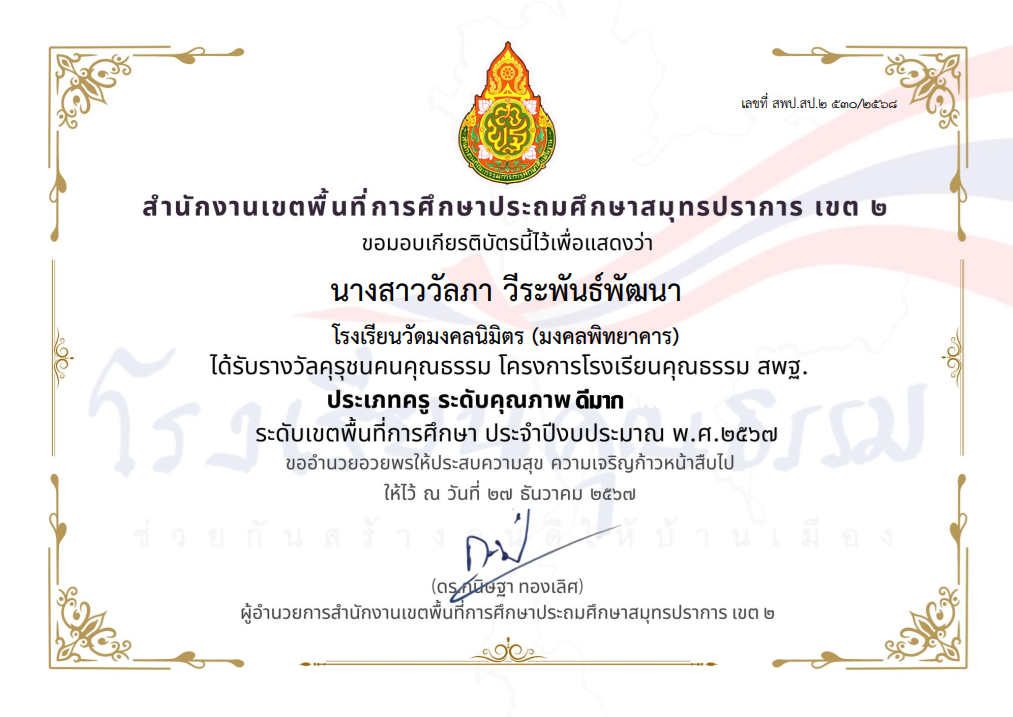 นางสาววัลภา วีระพันธ์พัฒนา ได้รับรางวัลคุรุชนคุณธรรม โครงการโรงเรียนคุณธรรม สพฐ. ประเภทครู ระดับคุณภาพ ดีมาก ระดับเขตพื้นที่การศึกษา ประจำปีงบประมาณ พ.ศ.2567 |